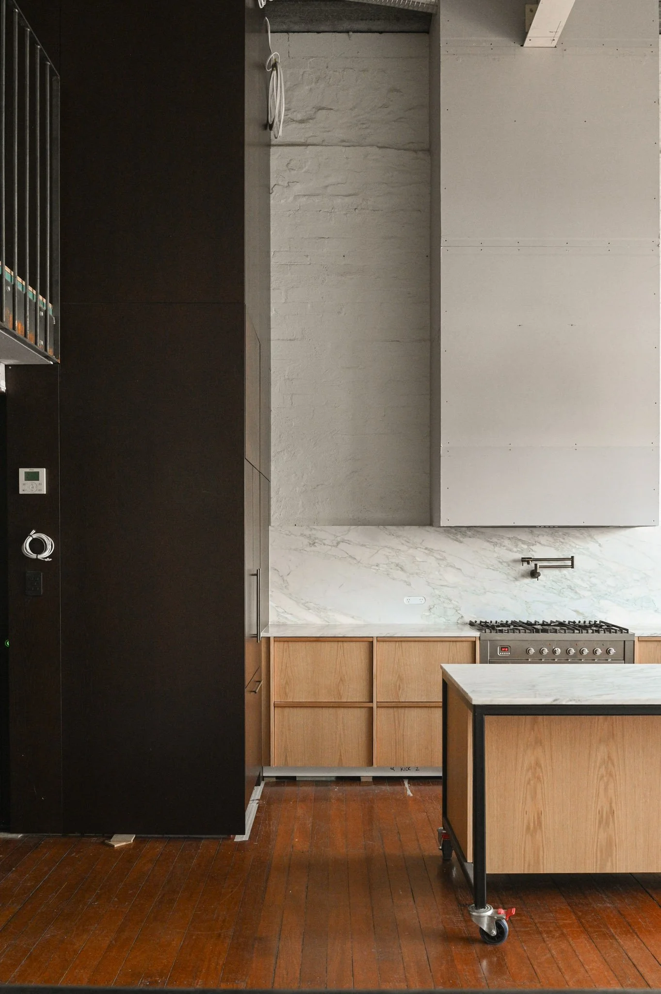 4.8-metre ceilings are celebrated in the kitchen, with full-height cabinetry, wrapping the new lift shaft