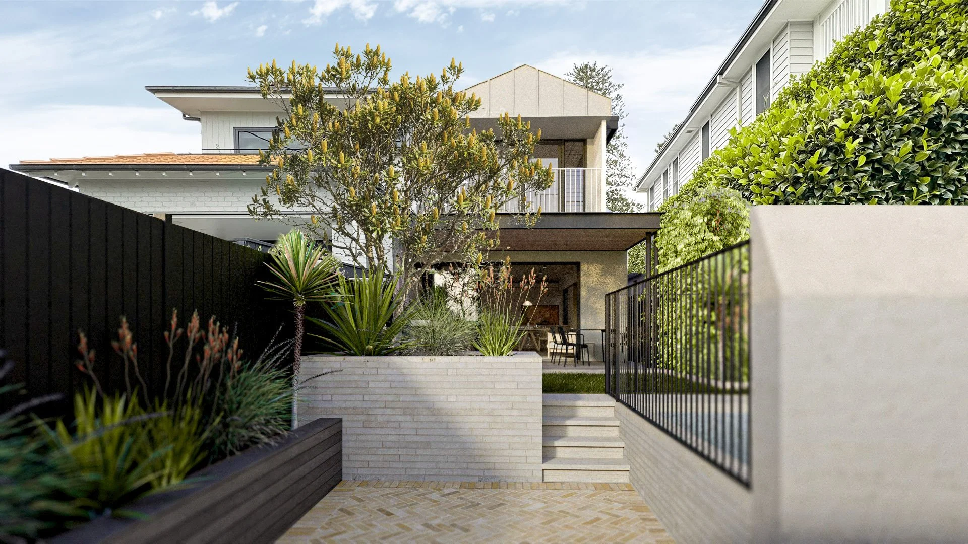 The Dulwich Hill project centres around a rear extension containing an architecturally detailed pergola and paved entertaining area, designed to extend the home seamlessly into the rear yard, and allow for entertaining up to 20 guests.