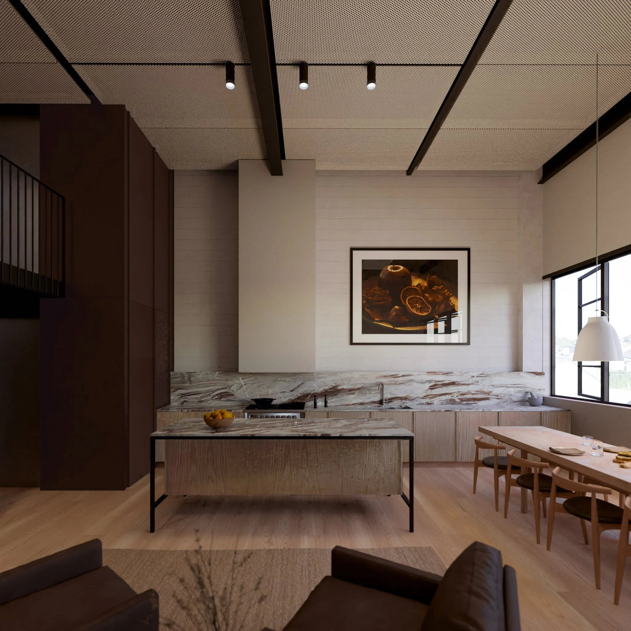 Currently under construction, this converted warehouse in Redfern is being reimagined as a home that is both practical for today and adapted for the future. A new lift and garage improve accessibility and circulation across four storeys, while a fifth-storey loft captures sweeping city views. The material palette blends industrial steel with refined stone and timber detailing, striking a balance between robustness and warmth.